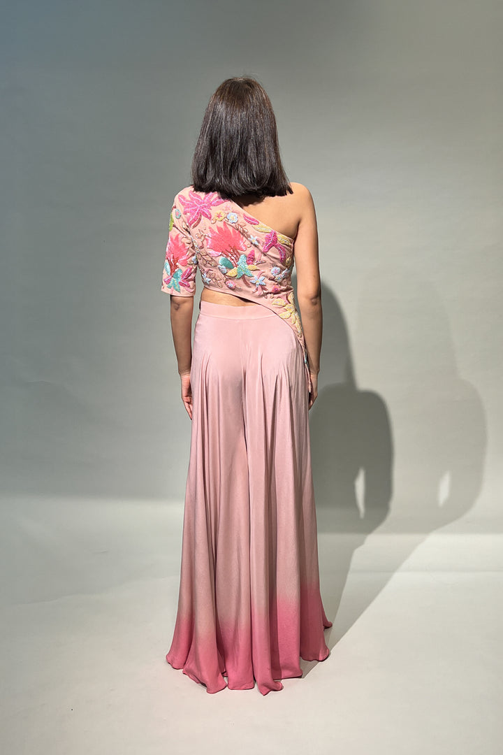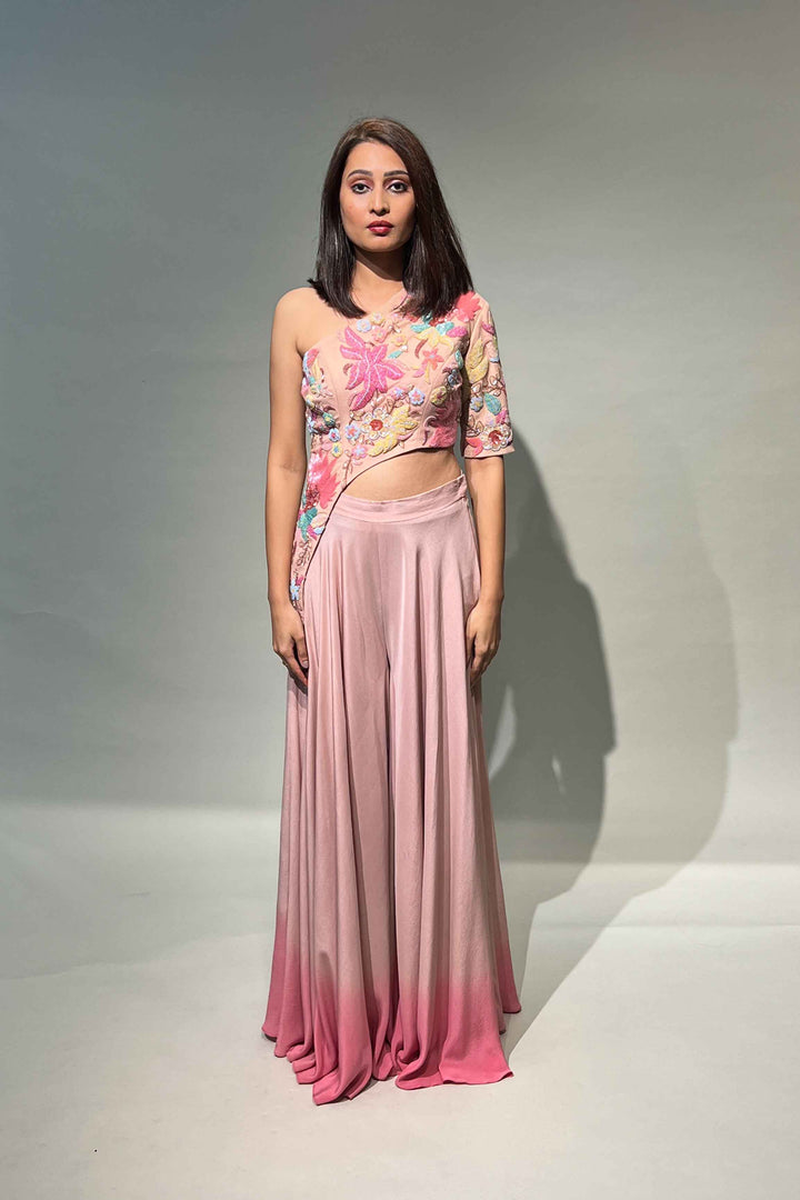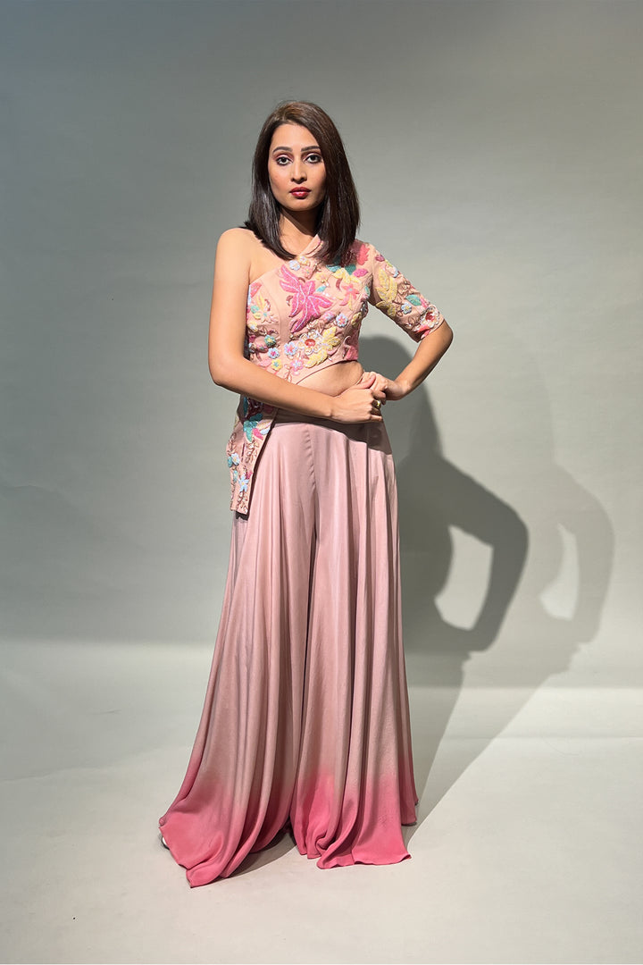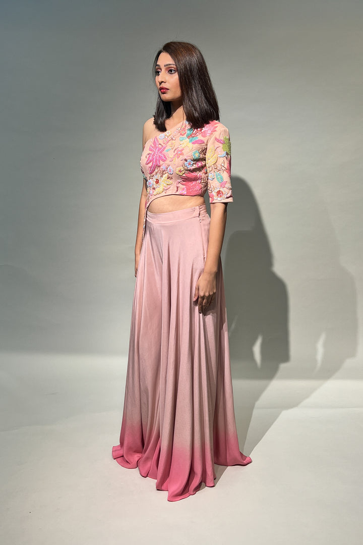 An asymmetric one-shoulder blouse, intricately embroidered using colourful beads and tubes paired with a divided ombre skirt perfect for carnival themed occasions or mehendi ceremonies.