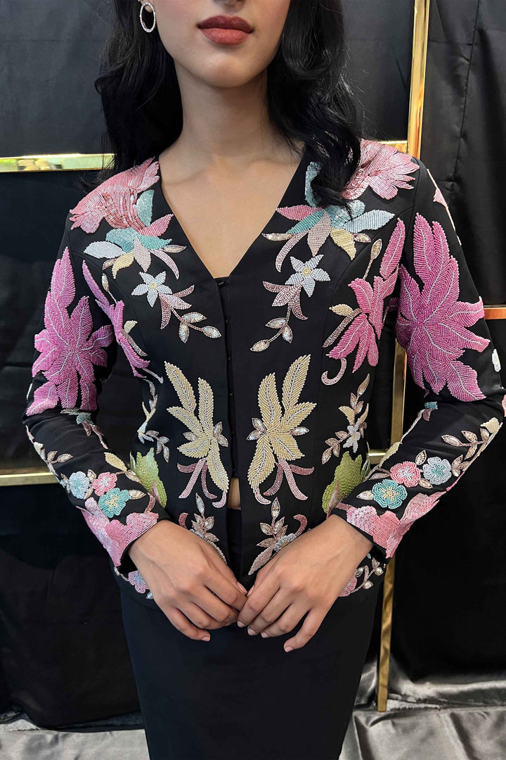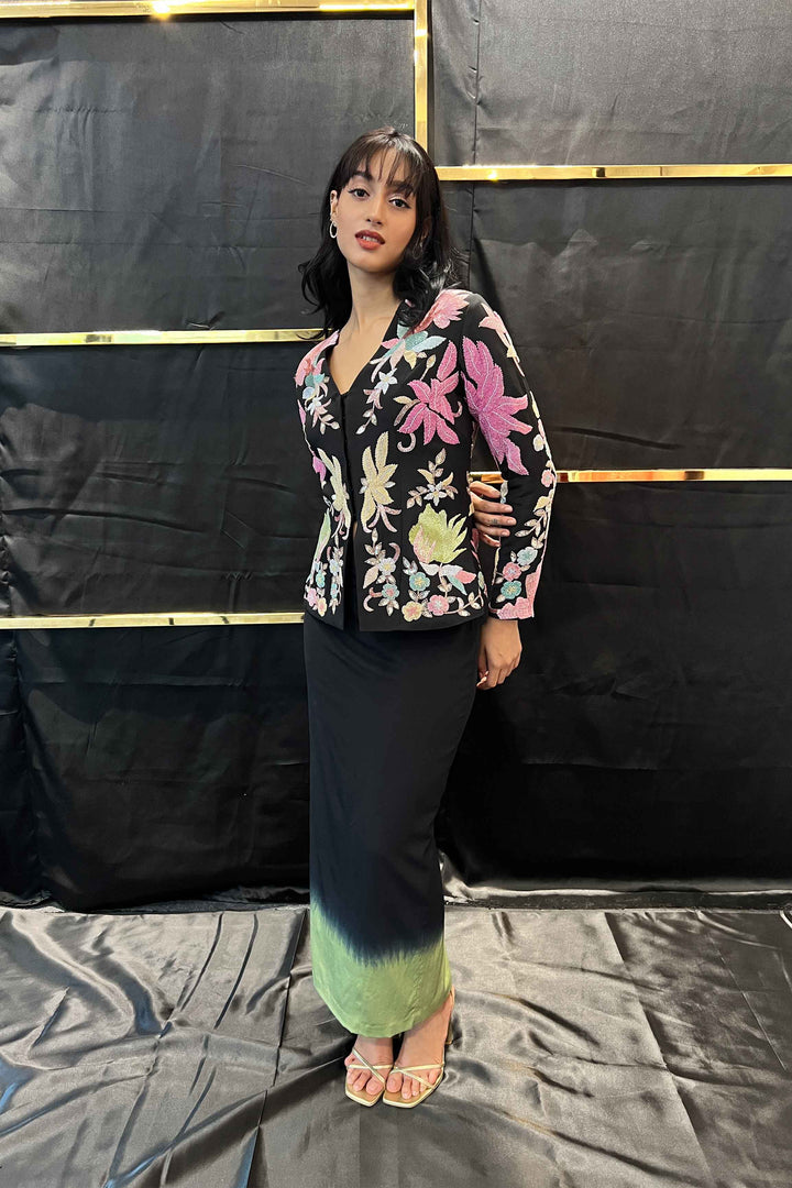A structured blazer-cut jacket with a front hook placket heavily hand embroidered with multi colored beads and katdana, paired with an ombre pencil skirt in pure crepe lycra.