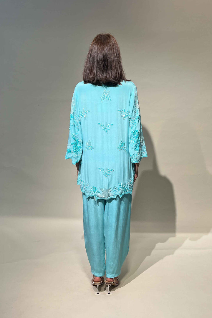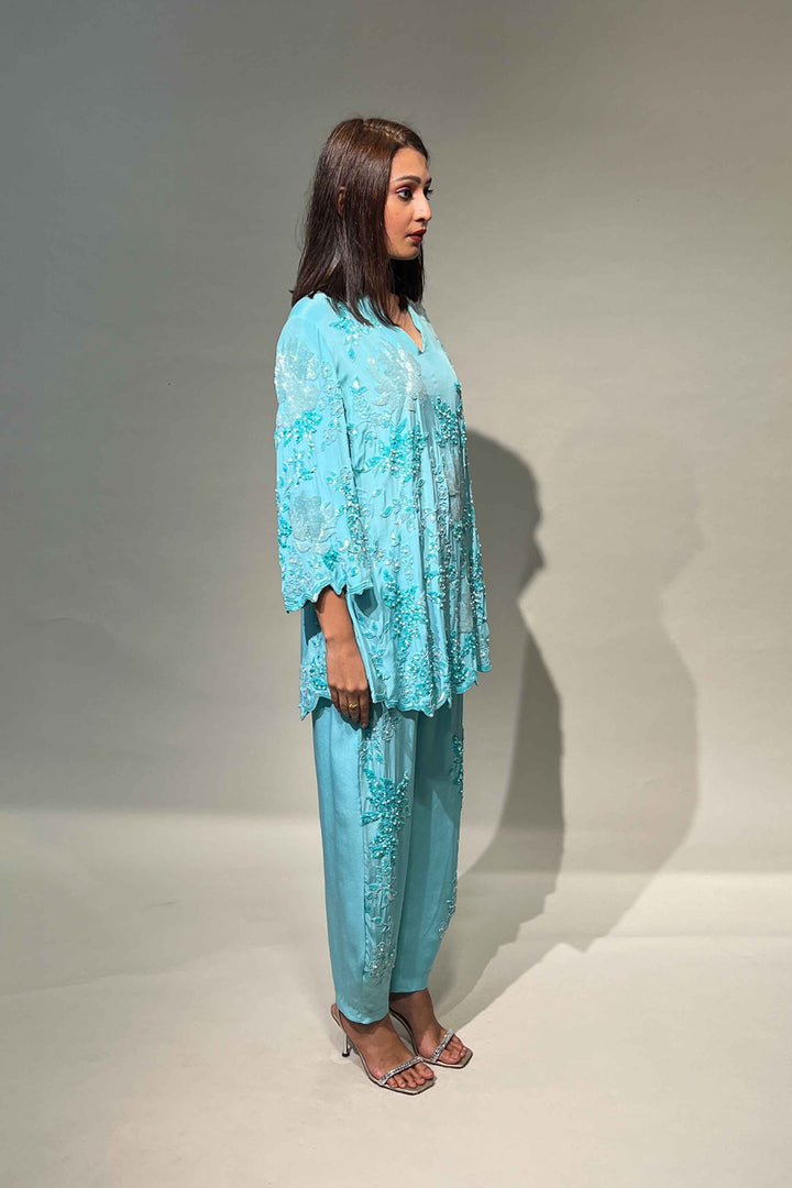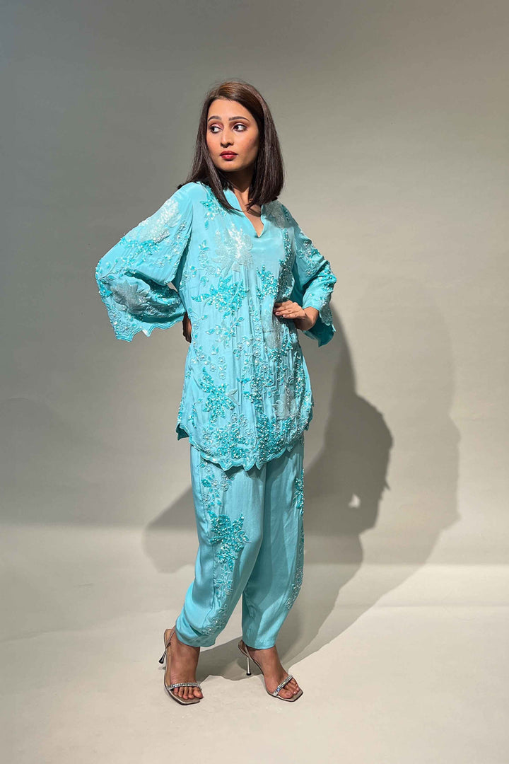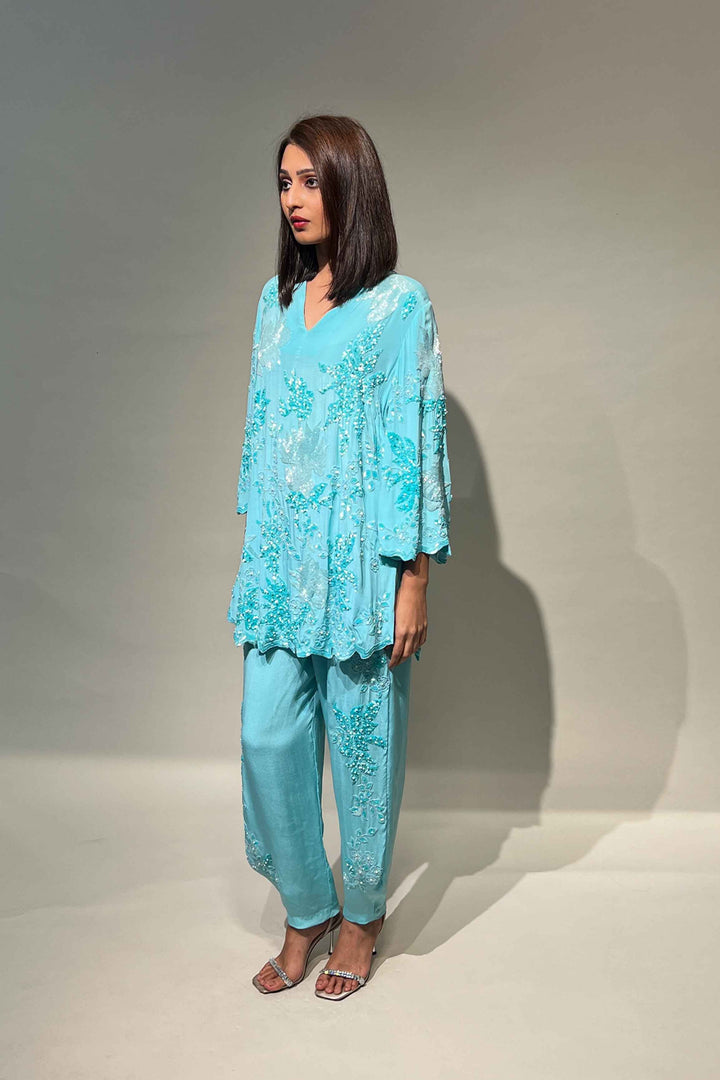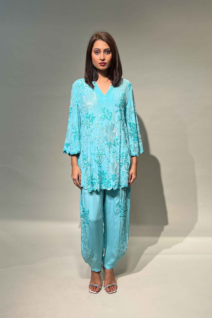 A short asymmetric hemline kurta with bell sleeves enhanced with delicately done sequence and hand embroidery.