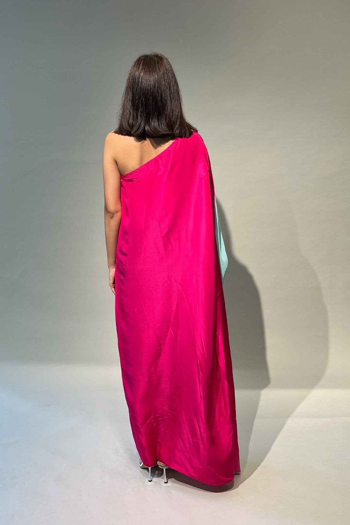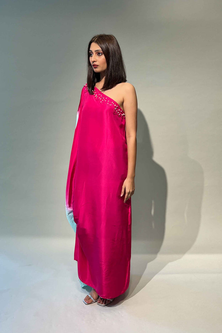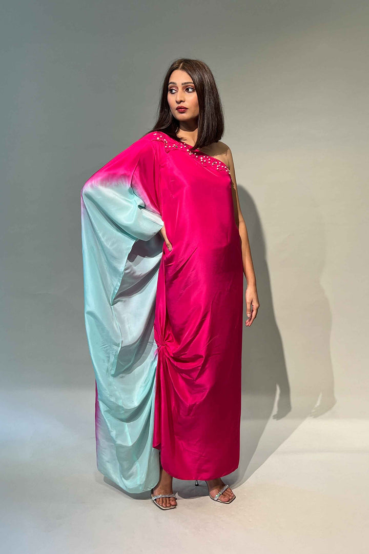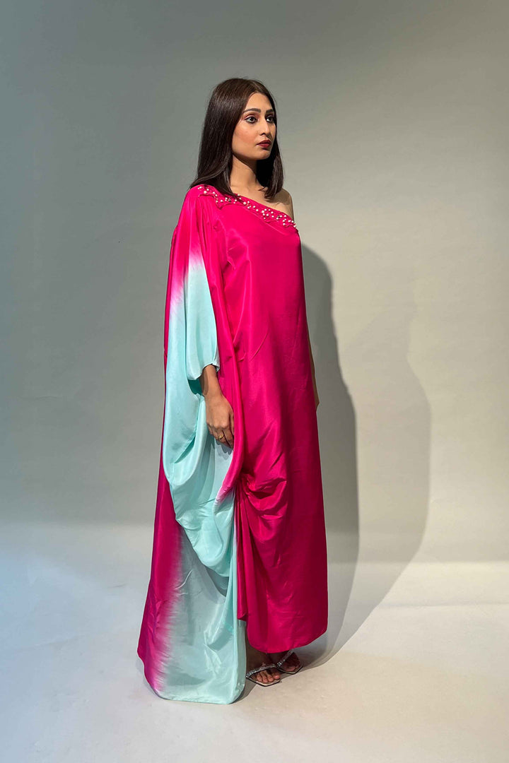 One shoulder fluidic kaftan enhanced with hand-embroidered pearl detailing on the neckline. Made in pure silk fabric for best touch and feel.