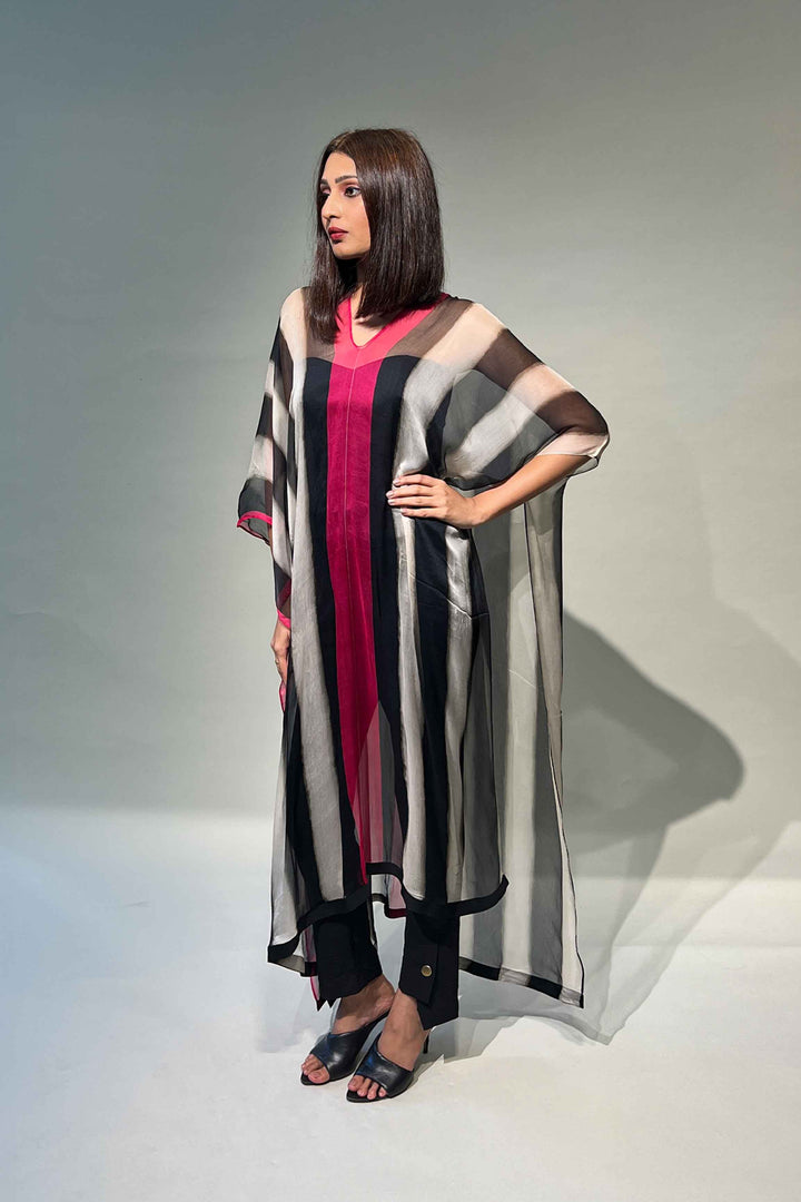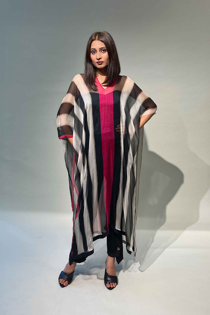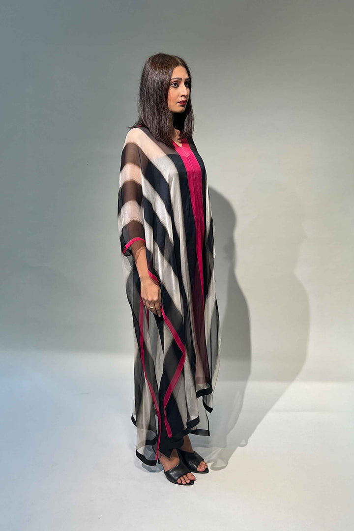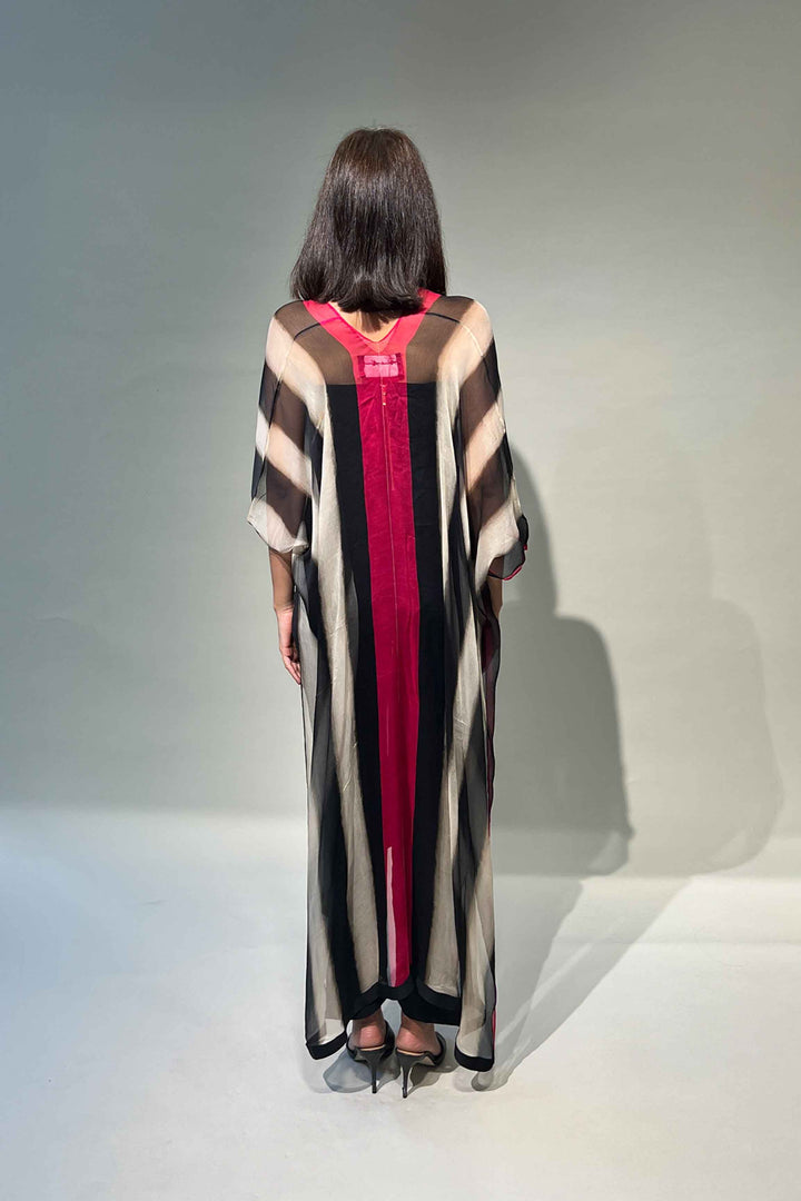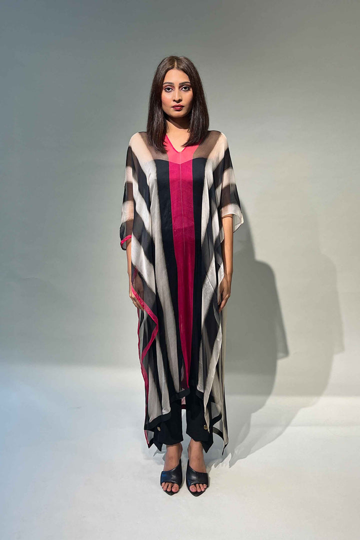 A fluidic silk Kaftan, digitally printed finished with a black trim.